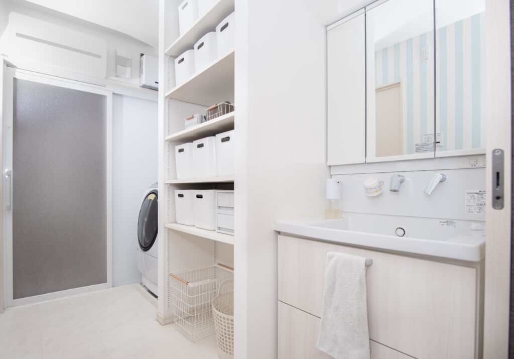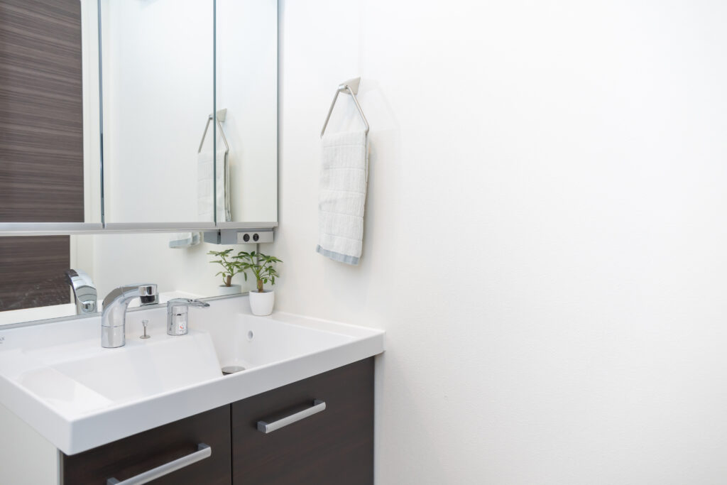 洗面化粧台は、主に洗面ボールとその下にある収納部分を壁面に取り付けます。その後上部に鏡と収納棚を取り付けます。最近では、洗面ボールと鏡の間に水栓が付くことも多くあります。