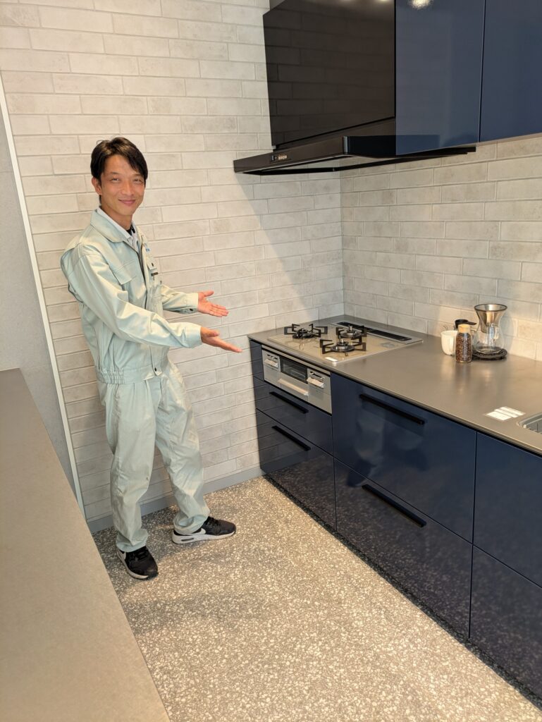 リフォーム現場では、経年により壁面や床面に僅かな倒れや歪が生じていることがあります。しかし、システムキッチンは水平垂直に設置することを基本としておりますので、その様な僅かな倒れや歪を極力目だたないように吸収させつつ設置を行っております。また、キッチンパネルの貼付けについては清掃性と美観を重点としてパネル割を考えております。